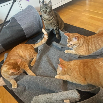 Als Belohnung winkte eine Pflegestelle, die die Geschwisterchen liebevoll umsorgte und auf ein schönes Katzenleben vorbereitete. Die Zeiten der Ruhe war mit den fünf Rackern allerdings vorbei. Einen Sack Flöhe zu hüten wäre einfacher gewesen. Nach einiger Zeit musste der Wurf jedoch Platz für kleinere Kitten machen und leider in das Tierheim übersiedeln. Bald schon klopften Interessenten an die Tür unseres Partnertierheims ANAA und nach und fanden die Geschwister ihr Zuhause und Chiquitita musste von ihren Geschwistern Abschied nehmen. Sie vermisste ihre Geschwister und obendrein hatte sie nicht lange zuvor den Umzug von ihrer Pflegestelle ins Tierheim erleben müssen, was für die sensible und liebebedürftige Maus eine Herausforderung war. Daher ging man für die zarte Chiquitita nochmals auf Suche und fand zum Glück einen gerade frei gewordenen, passenden Platz auf einer Pflegestelle. Das kleine Mädchen konnte nun wieder die Geborgenheit eines Zuhauses genießen.