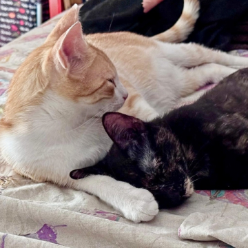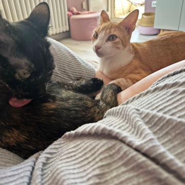 Die freudige Begrüßung der sehr sozialen Katzen der Pflegestelle überforderte Lunita zunächst. In der Quarantänebox hatte sie nur Kontakt zu Menschen gehabt und nun wurde an ihr herumgeschnüffelt, jede ihrer Bewegungen beobachtet, sie wurde angemaunzt und immer von einem pelzigen Schatten verfolgt. Doch nachdem sich ihr anfängliches Misstrauen gelegt hatte, fand Lunita es doch recht nett, samtpfötige Gesellschaft zu haben.